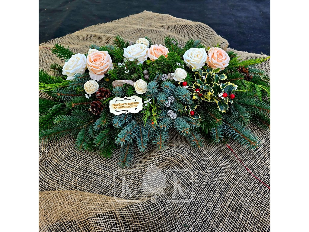 Smútočná ikebana je ručne vytváraná priamo u nás v kamennej predajni z čerstvej živej čačiny, upevnená na brezovej doštičke a doplnená o prírodné dekoračné prvky ako sušené kvety, plody rastlín, konáriky či drobné drievka.